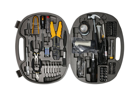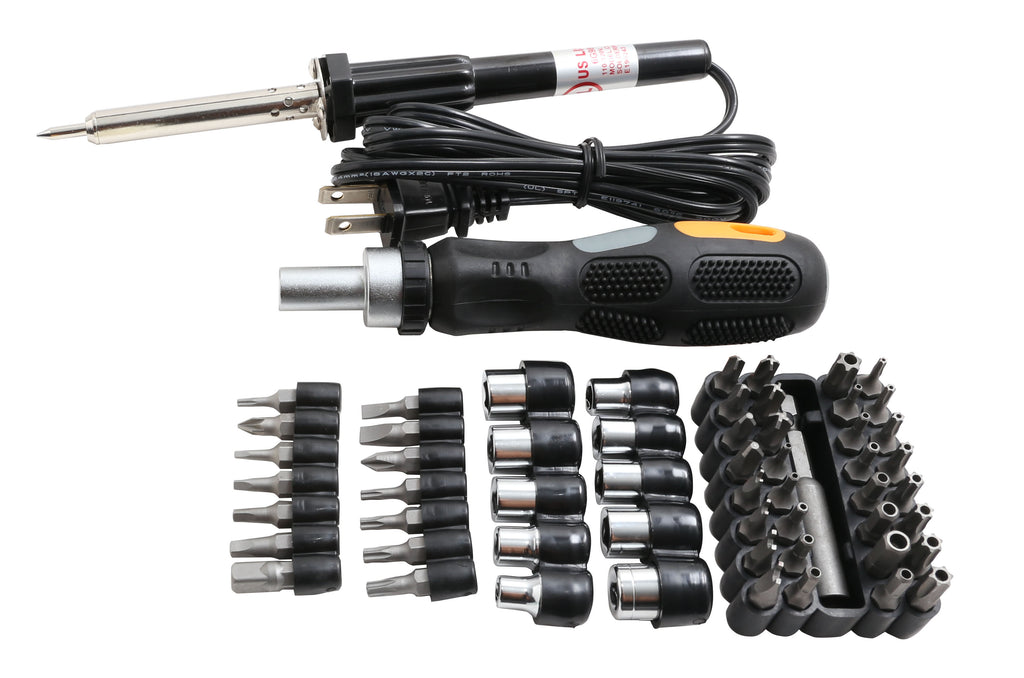 1 pc Pozi : PZ1, 1 pc Adaptor Bit for Socket; 10 pcs Sockets : 3/16" -1/4" -5/16" -11/32" -3/8" , 6mm - 7mm - 8mm - 9mm - 10mm; Reversible Ratchet Handle; 42 pcs Terminals; Pen Knife; Tweezers Serrated Inside Point; 5" Long Nose Pliers; 4 " Side Cutter; Mini Hammer; 9 pcs Allen Wrenches; Vacuum Cleaner Set with Attachments; Cable Ties; Magnetic Telescoping Pick Up Tool; Electronic Socket Tester; 6 pcs Precision Screwdriver Set; IC Extractor; 3-Claw Parts Retriever; Mini Flashlight; Insulated Tape; 2 pcs Batteries; 9 pcs Hollow Star: T8H, T10H, T15H, T20H, T25H, T27H,T30H, T35H, T40H; 12 pcs Hex Key: 5/64" , 3/32" , 7/64" , 1/8" , 9/64" , 5/32" , 2mm, 2.5mm, 3mm, 4mm, 5mm, 6mm ; 4pcs Tri-ing: 1,2,3,4; 4 pcs Spanner: 4mm, 6mm, 8mm, 10mm; 3 pcs Torq: 6mm, 8mm, 10mm; 1 pc 60mm Magnetic Bit Holder; 7-Bits: 4 pcs Star : T10,T15,T20,T25 ; 2pcs Slotted: 4, 6mm; 1 pc Philips: PH1; 7-Bits: 1 pc Star : T8, 4 pcs Square : S0,S1,S2,S3; 5" Wire Cutter/Stripper; 8" Crimping Tool; Brush; Soldering Iron; Solder Wick; Solder Reel
