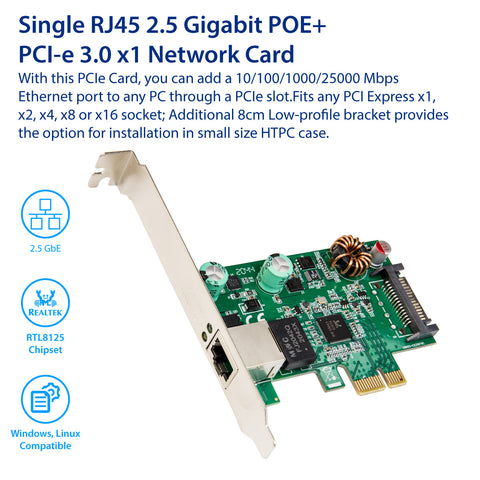 • With this PCIe Card, you can add a 10/100/1000/25000 Mbps Ethernet port to any PC through a PCIe slot.Fits any PCI Express x1, x2, x4, x8 or x16 socket; Additional 8cm Low-profile bracket provides the option for installation in small size HTPC case.