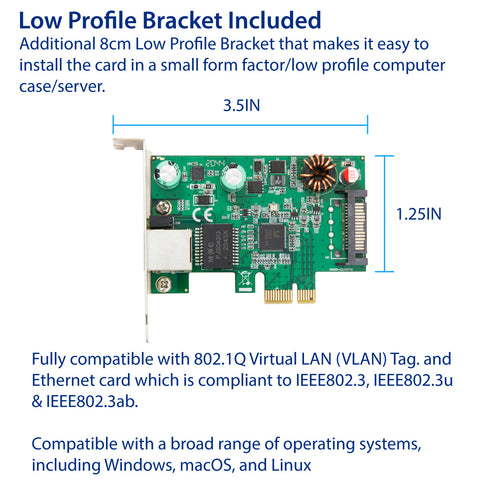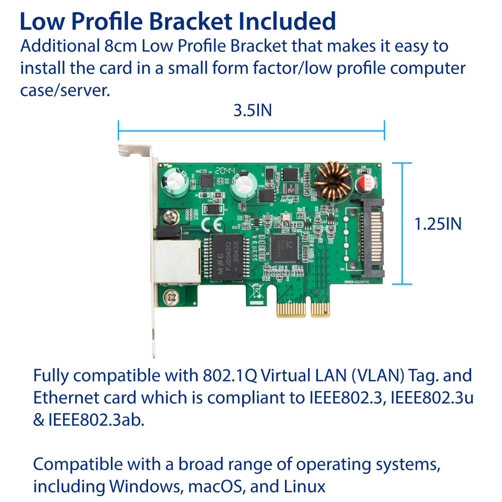 • The high quality PCIe 2.5 Gigabit NIC with 12cm profile bracket and Additional 8cm Profile Bracket that makes it easy to install the card in a small form factor/low profile computer case/server.