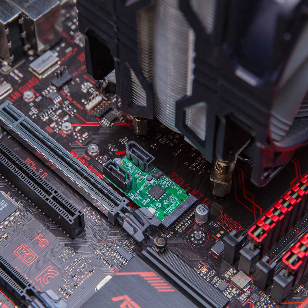 This converter is designed to convert a M.2 port into a standard SATA III RAID port. Instead of installing a M.2 card, any SATA hard drive, optical drive or SATA storage device can now be connected to the M.2 female connector (host port). It is a great tool to add more SATA ports to the system and to utilize the available M.2 connector in Desktop systems.