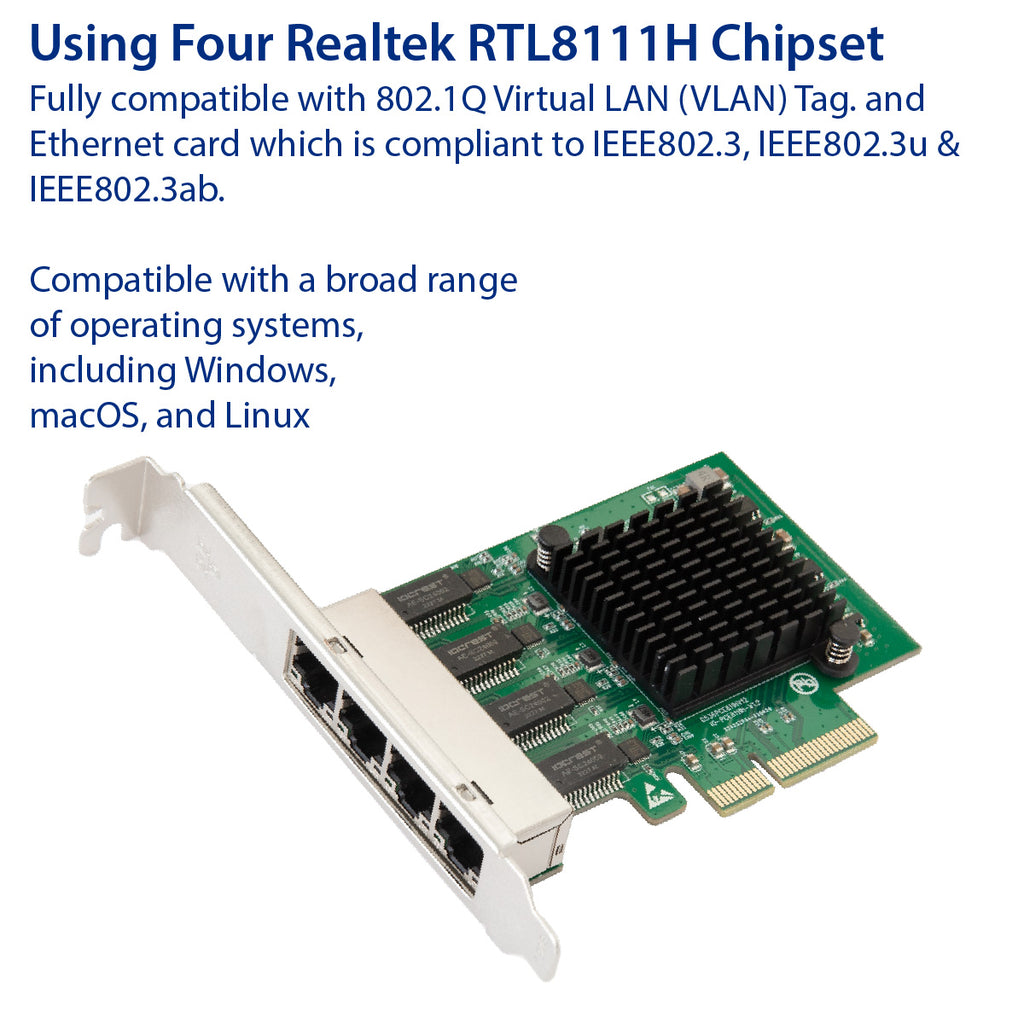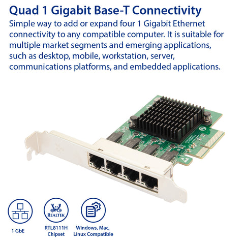 Provides Quad Gigabit Ethernet Connectivity to Mac Pro Towers and Windows PCs. Simple way to add or expand Gigabit Ethernet connectivity to any compatible computer. It is suitable for multiple market segments and emerging applications, such as desktop, mobile, workstation, server, communications platforms, and embedded applications.
