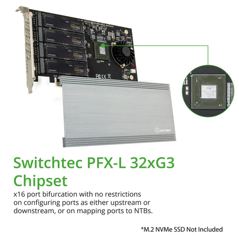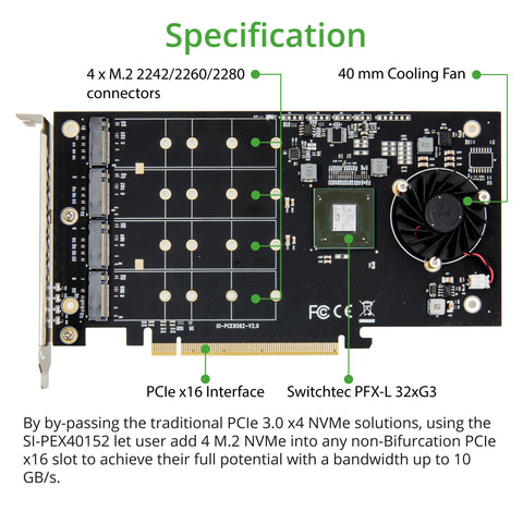 Switchtec PFX-L 32xG3 has a PCIe 3.0 x16 upstream port as well as four PCIe 3.0 x4 downstream ports. The switch is designed primarily for storage devices, enabling installation of four NVMe drives on a single card. SI-PEX40152 card uses PFX-L 32xG3 PCIe switches and therefore does not rely on PCIe bifurcation supported by CPU or PCH (i.e., they will work on closed end systems that have limited PCIe bifurcation capabilities) as well as on software RAID technologies supported by the platform. Dedicated PCIe 3.0 x16 bus bandwidth fully maximizes NVMe SSDs performance, up to 128 Gbps bandwidth. Delivers unprecedented fast transfer speed via intelligently aggregated Dual x16 PCIe 3.0 bus bandwidth NVMe RAID is supported base on the motherboard chipsets. Support software RAID 0 for Windows 10.Able to boot on system.