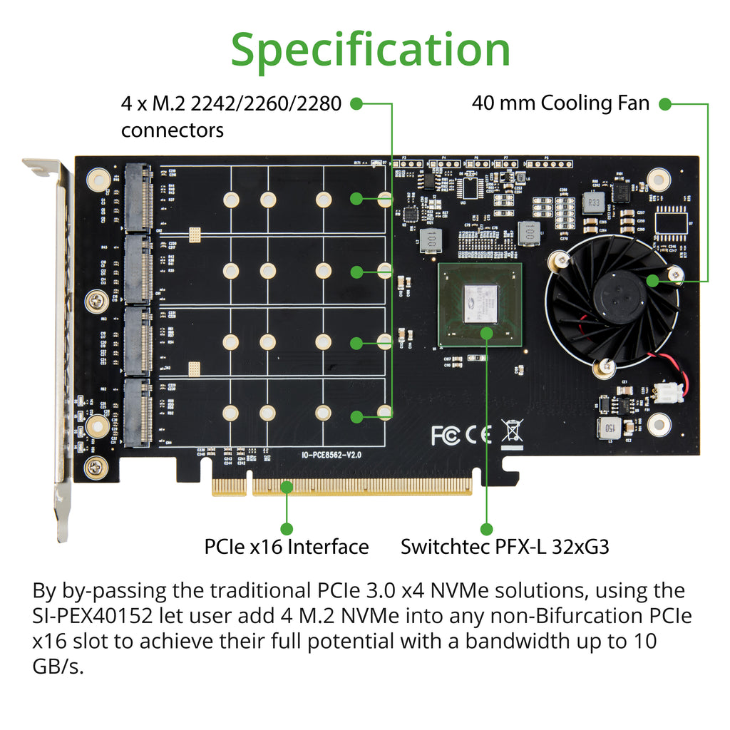 The IO CREST SI-PEX40152 is a great accelerated secondary storage solution for any workstation with true PCIe 3.0 x16 bandwidth. It has 4 M.2 NVMe ports to accept 4 NVMe M.2 SSDs, so each NVMe M.2 SSD has dedicated PCIe 3.0 x4 bus bandwidth. It delivers transfer speeds 20 times faster than SATA SSDs. By by-passing the traditional PCIe 3.0 x4 NVMe solutions, using the SI-PEX40152 will allow user add 4 M.2 NVMe into any non-Bifurcation PCIe x16 slot to achieve their full potential with a bandwidth of up to 10,500 MB/s. Unlike onboard DMI 3.0 based NVMe solutions or Single NVMe PCI-e x4, which are forced to share a single PCIe 3.0 x4 lane with the motherboard's data ports, the SI-PEX40152 combines 4 - M.2 drives to be able to run on PCIe 3.0 x16 lane. This unique architecture allows the drive to interface directly with the platform's CPU, which provides PCIe x4 bandwidth for each NVMe SSD!